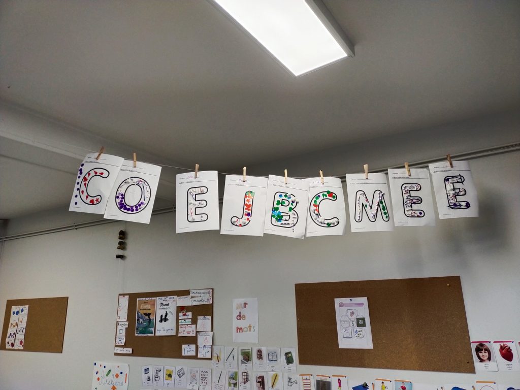 En petite section, nous avons travaillé sur l’initiale de notre prénom. Nous avons appris à la reconnaître parmi d’autres et à la nommer. Nous l’avons décorée à l’aide de morceaux de paille, de laine et de gommettes.